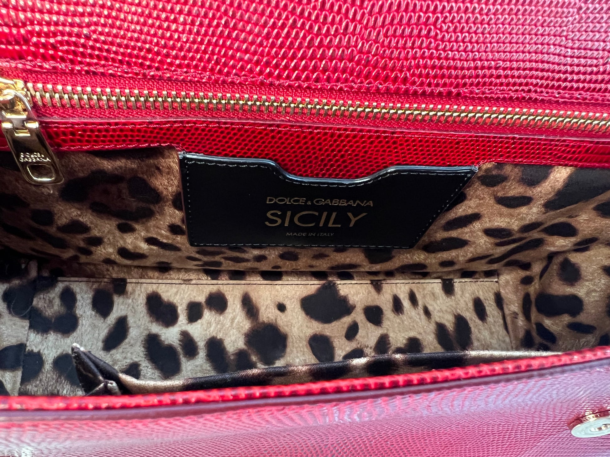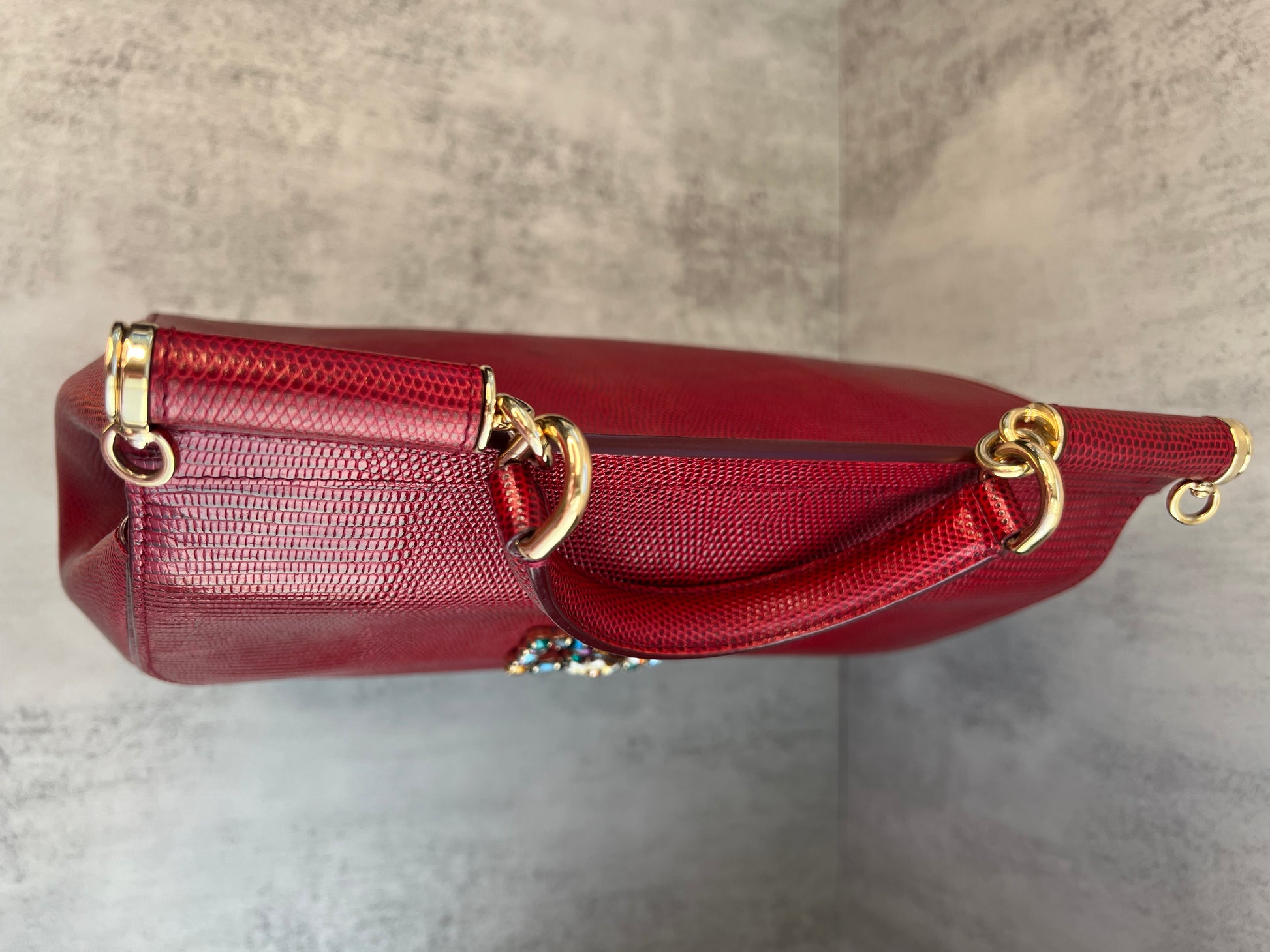 Dolce & Gabbana Sicily Handbag, Red Lizard Embossed Leather with Crystal D&G Logo