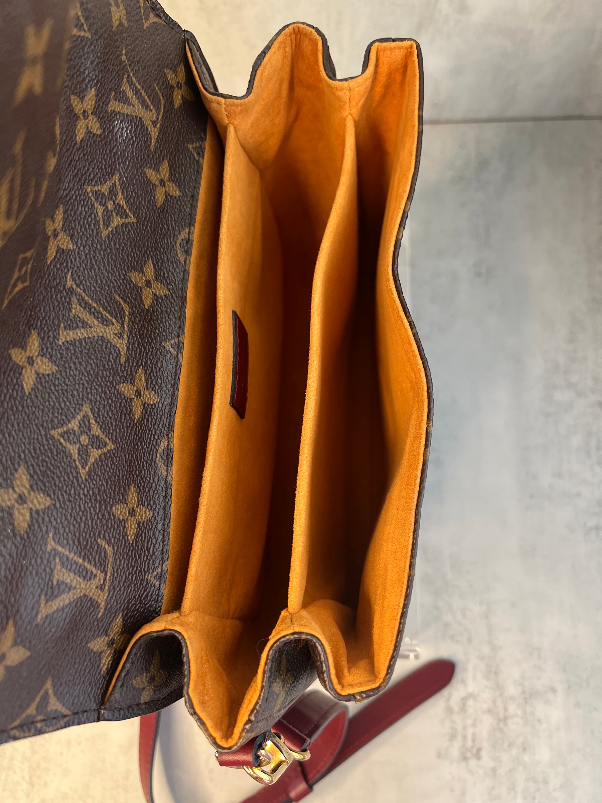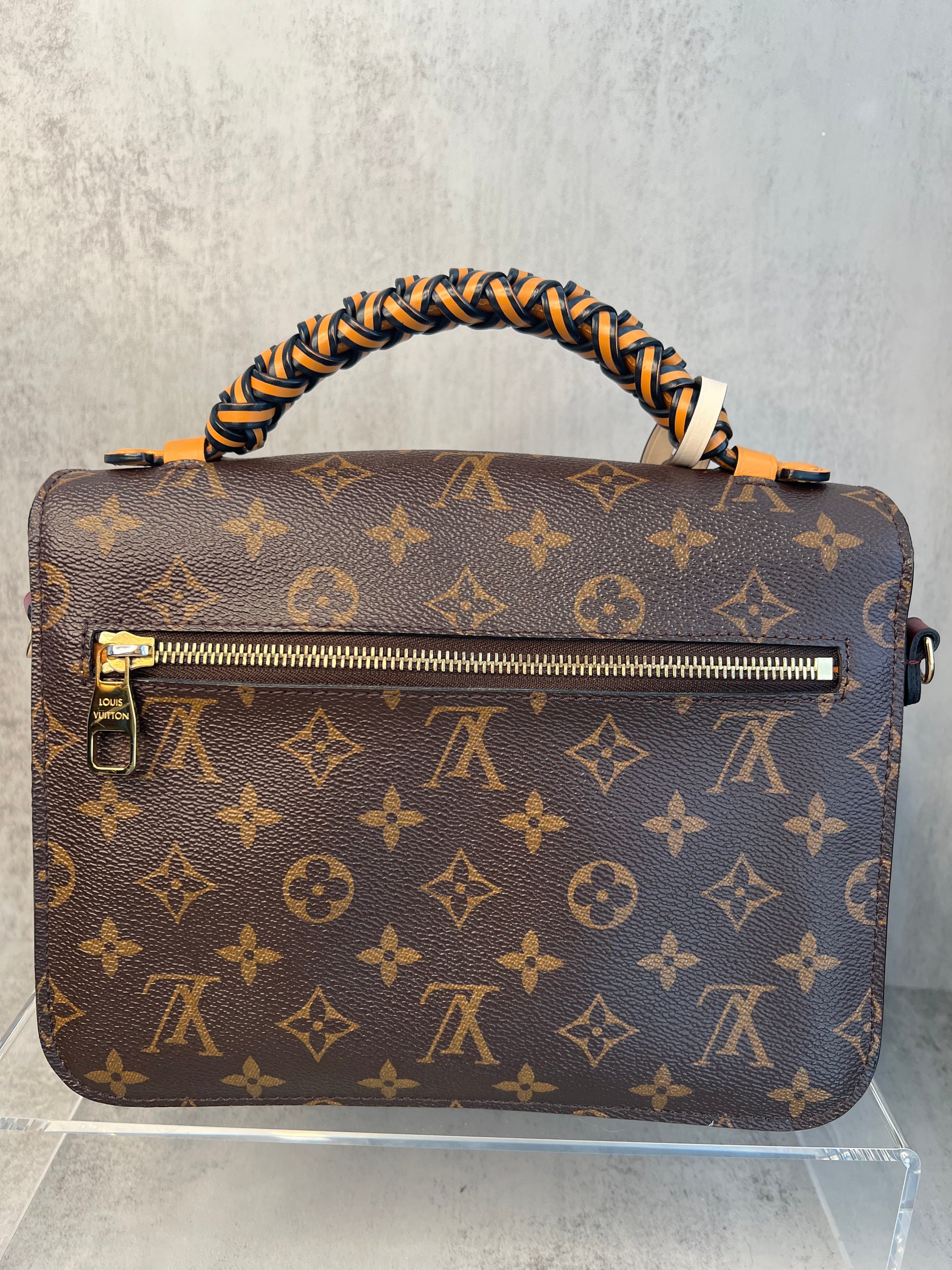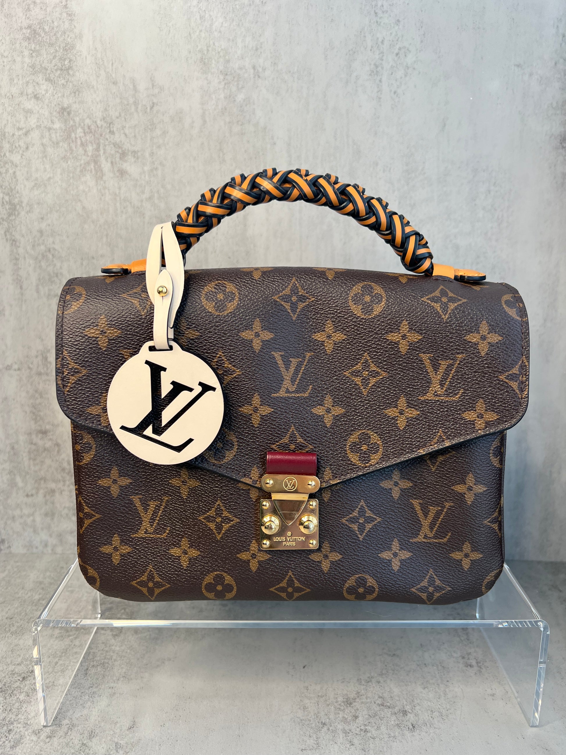 This LOUIS VUITTON Monogram Braided Pochette Metis in Safran is limited edition. It is finely crafted of classic Louis Vuitton monogram toile canvas. The shoulder bag features an orange and black cowhide leather handle with a braided detail, an optional adjustable burgundy calfskin leather shoulder strap, a rear exterior zipper pocket, and a V-shaped front flap with a polished brass S-lock. The flap opens to a partitioned orange microfiber interior. This is the perfect messenger bag for everyday essentials with style and luxury.